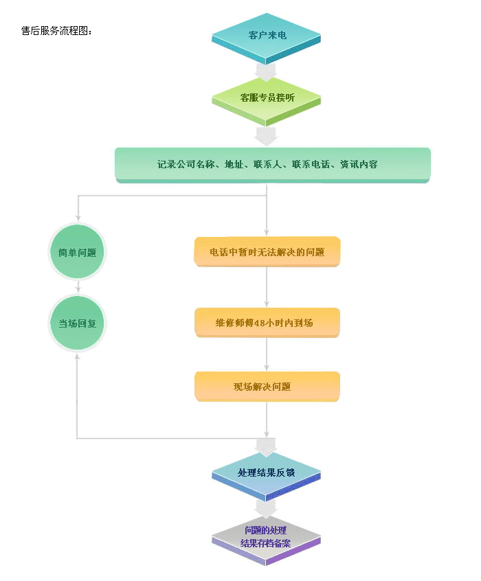 售后服務(wù)部是桂林宋宇機(jī)電設(shè)備有限公司非常重要的部門之一。它的主要工作是:接受客戶售后服務(wù)咨詢,為客戶受理、協(xié)調(diào)、處理,解決售后的各種疑難問題;主動(dòng)與客戶溝通、聯(lián)系,了解客戶的感受和需求,及時(shí)將客戶信息反饋至各相關(guān)管理部門和生產(chǎn)企業(yè)并妥善處理。